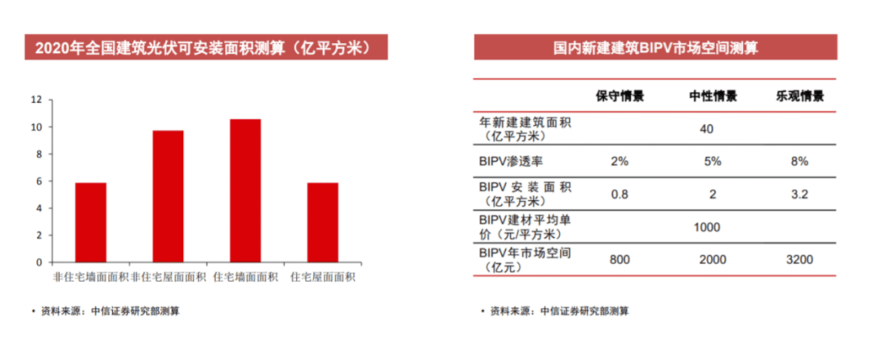 随着光伏装机量的持续扩容,BIPV渗透率及装机量将不断提升,未来有望持续放量。中信证券预测,未来每年新增建筑面积将达到40亿平方米以上,保守估计,光伏建筑一体化产品渗透率2%,粗略估算其一年市场规模接近1000亿元。加之部分存量建筑的光伏改造需求,BIPV总市场长期空间将达到万亿级别。