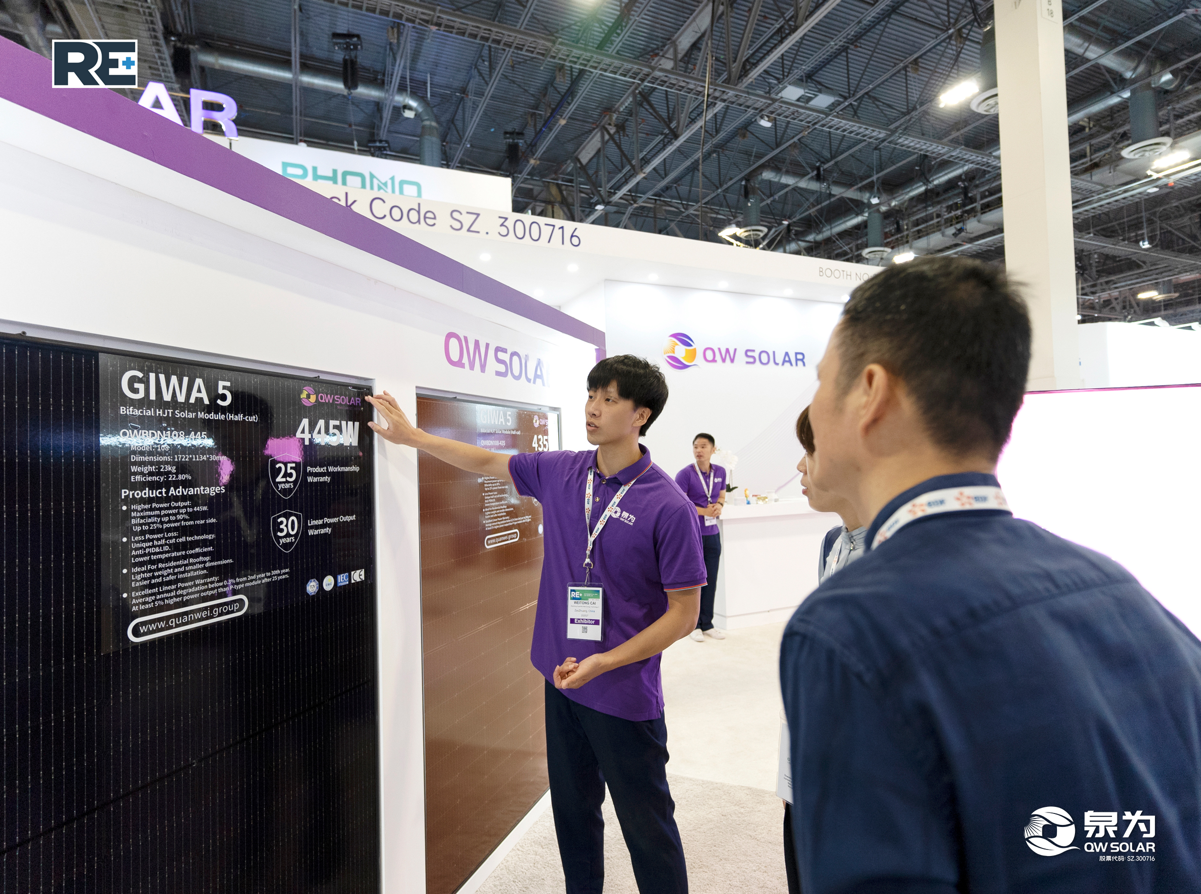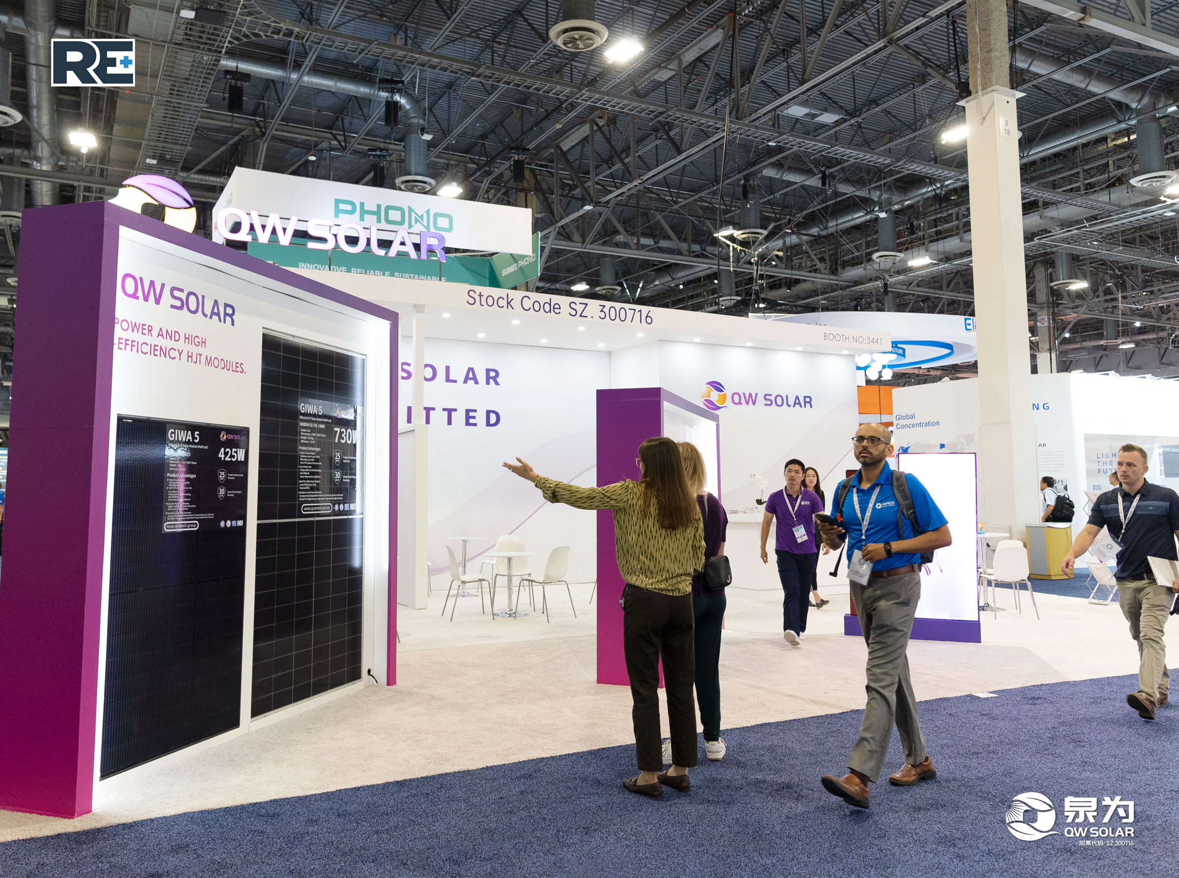 当地时间9月12日上午,美国拉斯维加斯金沙会展中心,北美最具影响力的新能源领域展览会RE+ 2023太阳能展第一天,刚顺利结束东南亚之旅的乐鱼体育app(SZ. 300716)团队再度携核心产品——“泉耀”系列高效异质结(HJT)组件产品(核心参数:730W最高组件功率、23.50%最高组件效率、25年产品质保及30年线性质保)于RE+展隆重登场(SANDS二层3441展位)。乐鱼体育app此次的展台设计理念充分运用了华丽的全新配色和务实的美式风格,将科技、审美与客户体验有机结合,为自己的北美首秀画下了浓重的一笔。